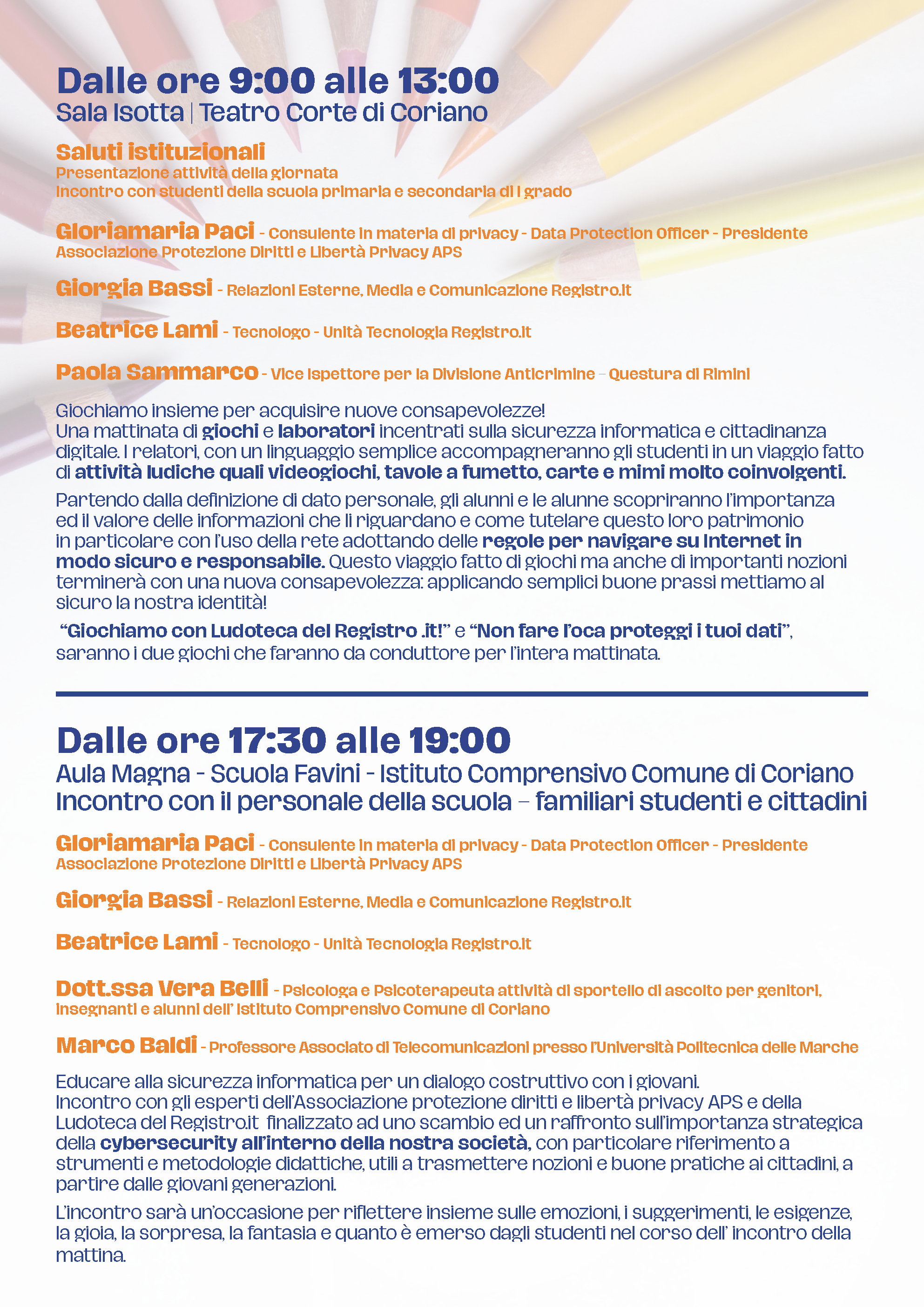 N.B. La sessione mattutina in presenza presso la Sala Isotta del Teatro Corte di Coriano è riservata unicamente ai docenti ed alle classi dell' Istituto Comprensivo Comune di Coriano. La sessione pomeridiana, in presenza presso l' Aula Magna - Scuola Favini - Istituto Comprensivo Comune di Coriano è aperta a tutti. La partecipazione in modalità online è prevista per entrambe le sessioni.