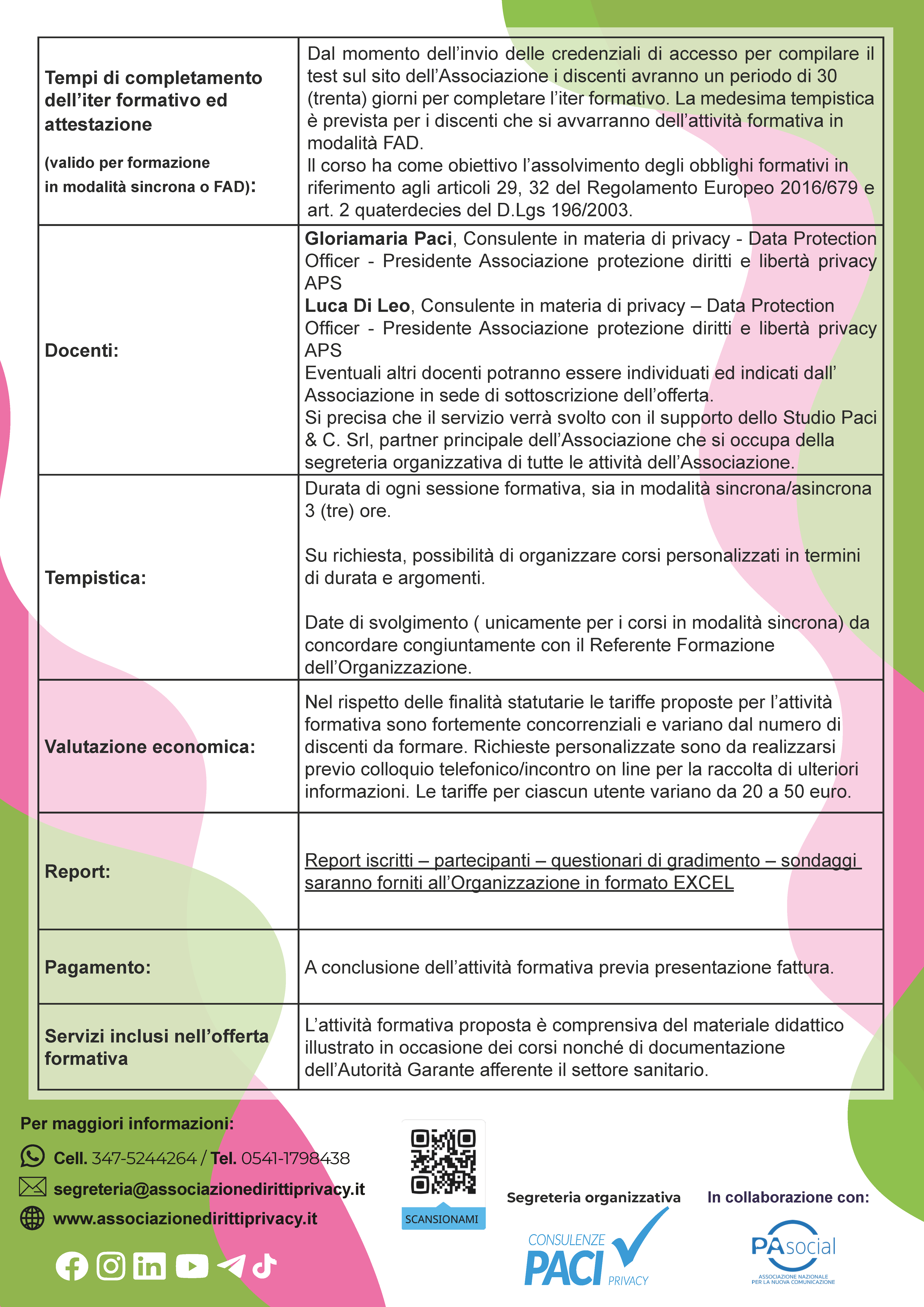 L’attività formativa intende approfondire gli argomenti relativi alle modalità organizzative e gestionali da adottare in tema di sicurezza e protezione dei dati personali applicato alla sanità.