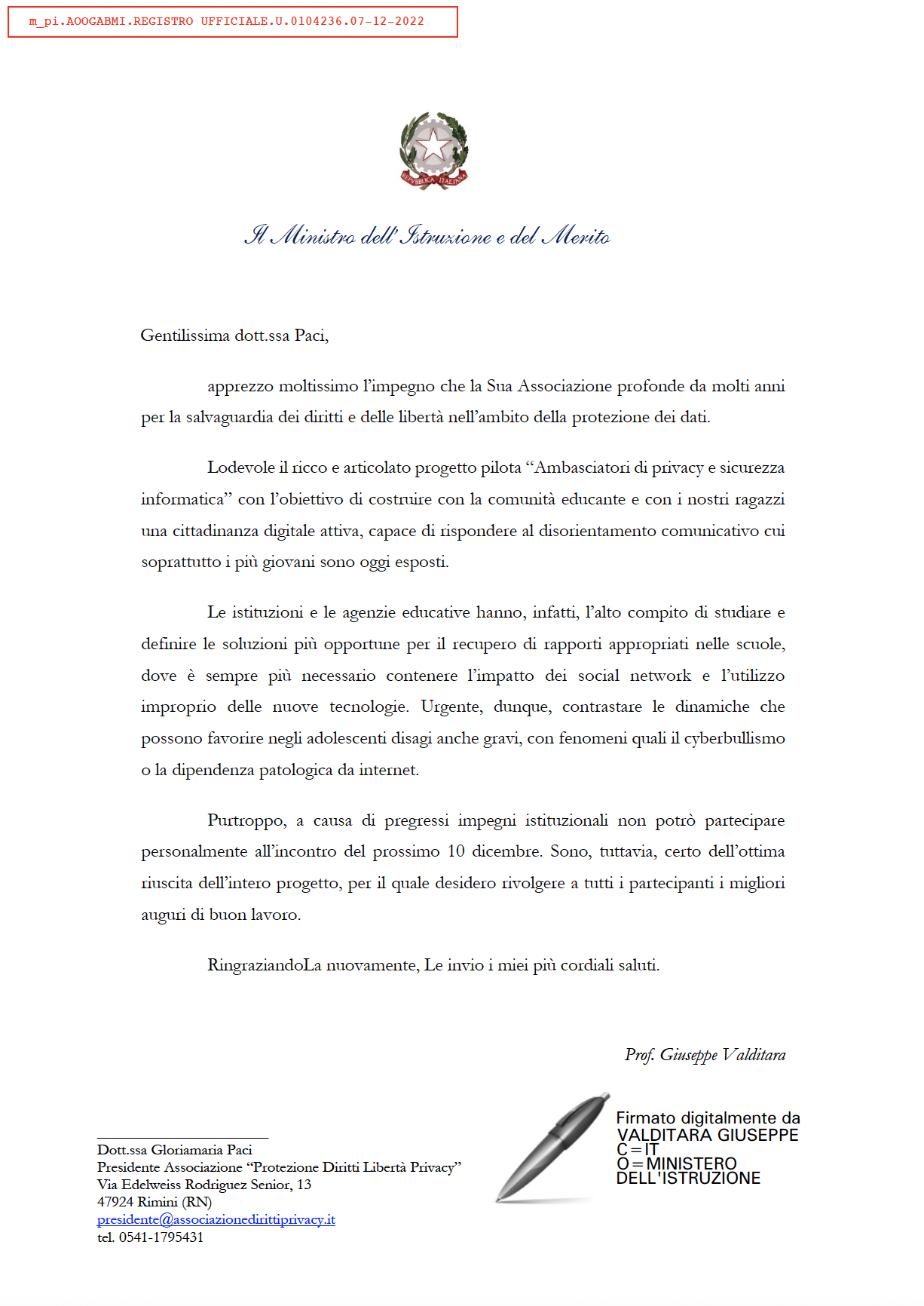 In questa prima edizione del progetto abbiamo ricevuto il patrocinio gratuito dell’Autorità Garante per la protezione dei dati personali (a partire da ottobre 2022 sino a febbraio 2023) nonché un messaggio di saluti ed auguri da parte del Ministro dell’Istruzione e del merito Prof. Giuseppe Valditara.